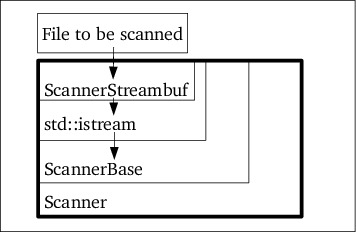 The member explicit Scanner(std::istream &in = std::cin, std::ostream &out = std::cout) now must make sure the ScannerStreambuf and std::istream are properly initialized before the ScannerBase can be initialized. the ScannerStreambuf is a wrapper around the actual std::istream, and it receives the initial stream from the constructor's arguments. This completes the ScannerStreambuf construction, making std::istream's std::streambuffer available. The interesting part comes next: now that the Scanner is an std::istream it can simply be passed to ScannerBase as the input file to be processed (cf. figure 1).